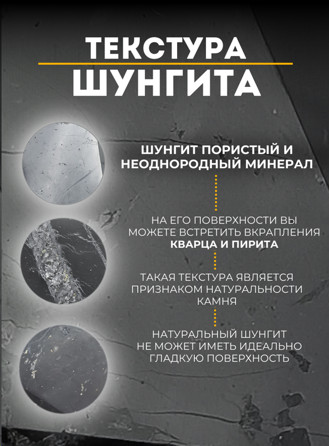 Вкрапления кварца и пирита, который совершенно естественны для шунгита и доказывают, что он натуральный, делают каждое изделие уникальным и неповторимым, по-настоящему стильно смотрящемся в интерьере.